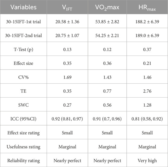 Data were presented as either mean ± SD or mean with 95% confidence intervals (95% CI) where specified. Normality of data was assessed by the Shapiro-Wilk statistic, and homogeneity of variance was verified with the Levene test. Reliability of the 30-15IFT was examined using the intraclass correlation coefficient (ICC), typical error of measurement (TE) expressed as a coefficient of variation (CV), and smallest worthwhile change (SWC) (Atkinson and Nevill, 1998). To assess the magnitude of the ICC, the threshold values were 0.1, 0.3, 0.5, 0.7, 0.9, and 1.0 for low, moderate, high, very high, nearly perfect, and perfect, respectively (Koo and Li, 2016). The SWC was calculated as 0.2 × between-subjects SD. In line with previous research, if the TE was higher than the SWC, the evaluation of the test was marginal; if the TE was similar to the SWC, the evaluation was “OK”; and if the TE was less than the SWC, an evaluation of “good” was given to the test.