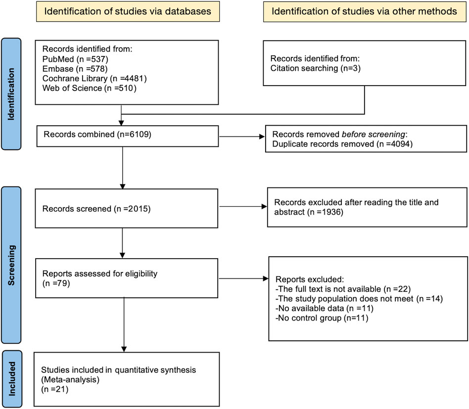 The process of literature identification and selection has been outlined in the PRISMA-MA flowchart (Figure 1). An initial comprehensive search across four electronic databases retrieved a total of 6,106 records, with an additional three studies identified through manual citation tracking. After removing 4,049 duplicate entries, 2,015 records were excluded during the preliminary screening of titles and abstracts. This left 1,936 articles for full-text evaluation based on the predefined eligibility criteria.