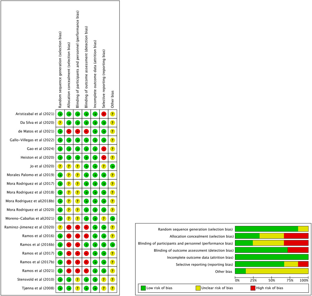 ROB was evaluated using the Cochrane Risk of Bias tool, as shown in Figure 2. Most studies (77.3%) demonstrated low risk in random sequence generation, including Aristizabal et al. (2021) and Gallo-Villegas et al. (2022). However, allocation concealment was more variable, with only 40.9% of studies rated low risk, while 31.8%, such as de Matos et al. (2021) and Ramirez-Jimenez et al. (2020), showed high risk. Performance bias was common: 36.4% of studies (e.g., Ramos et al., 2016) were rated high risk regarding blinding is often not feasible in exercise intervention studies. Outcome assessor blinding was more consistent, with 68.2% of studies judged as low risk.
