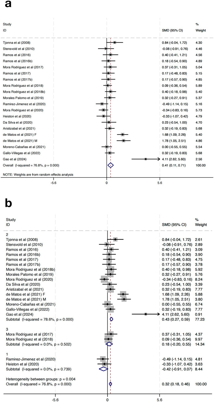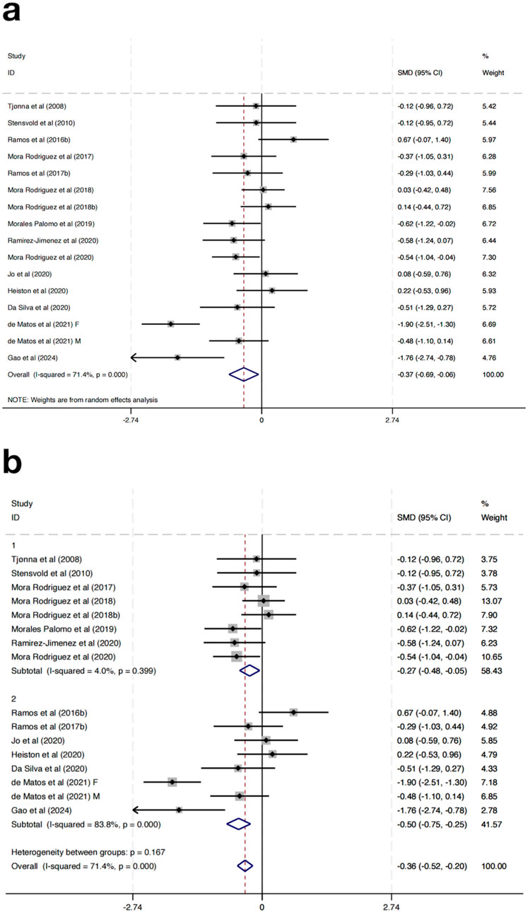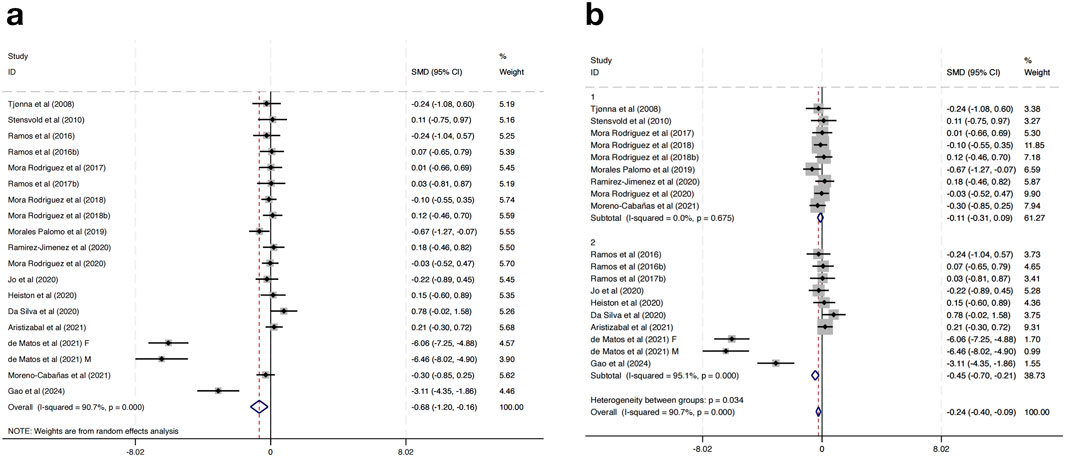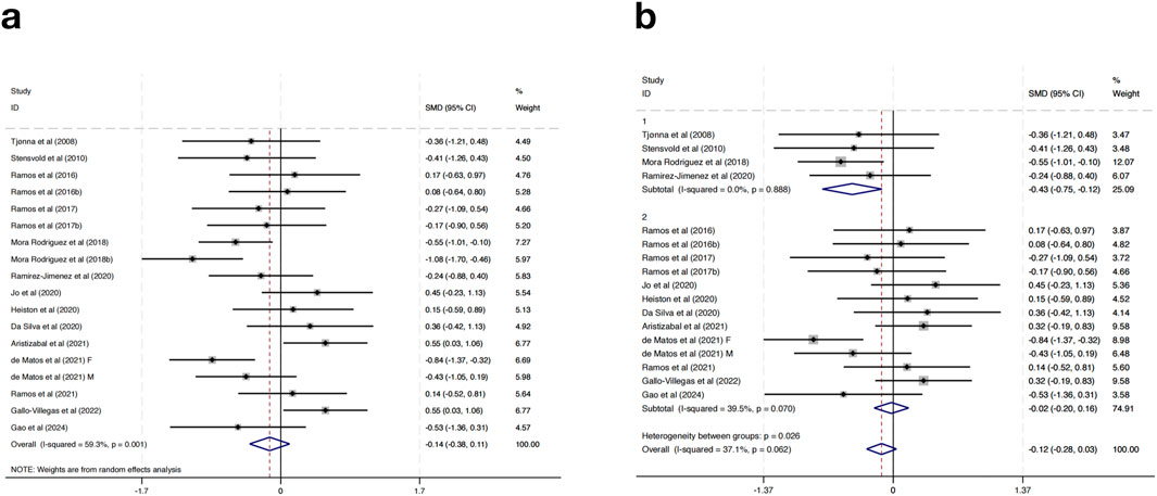 Two reviewers independently carried out the extraction of data from the eligible RCTs, each operating under blinded conditions to mitigate potential bias. To ensure uniformity and reliability in the recording process, a standardized extraction template was utilized. This form had been developed based on the recommendations provided by the Cochrane Consumers and Communication Review Group (Chandler et al., 2019). One included study de Matos et al. (2021) reported sex-stratified outcomes for men and women (de Matos et al., 2021) F and (de Matos et al., 2021) M undergoing high-intensity interval training. To improve the precision of pooled estimates and to explore sex-specific effects, we treated these two subgroups as independent data entries in the meta-analysis. Subgroup definitions were as follows: intervention duration was categorized as short-term (0–8 weeks), medium-term (9–16 weeks), and long-term (17–24 weeks). Geographic region was classified into European and non-European categories. These definitions were based on prior literature conventions and allowed for sufficient distribution of studies across subgroups to ensure meaningful comparison. This approach has been previously recommended when subgroup data are clearly reported and do not involve statistical dependence (Borenstein et al., 2021).