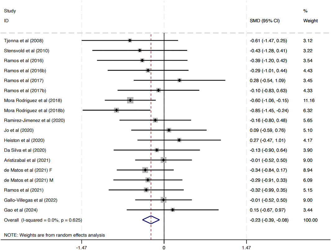 This study included 17 investigations examining the impact of HIIT on DBP. The combined analysis, conducted with a random-effects model, revealed that HIIT interventions resulted in a statistically significant decrease in DBP compared to control conditions (SMD = −0.23, 95% CI: -0.39 to −0.08, p < 0.01) (Figure 4). Importantly, the heterogeneity across studies was negligible (I2 = 0.0%, p = 0.625), indicating a high level of consistency in the direction and magnitude of the effect across different study populations, intervention protocols, and geographic locations.