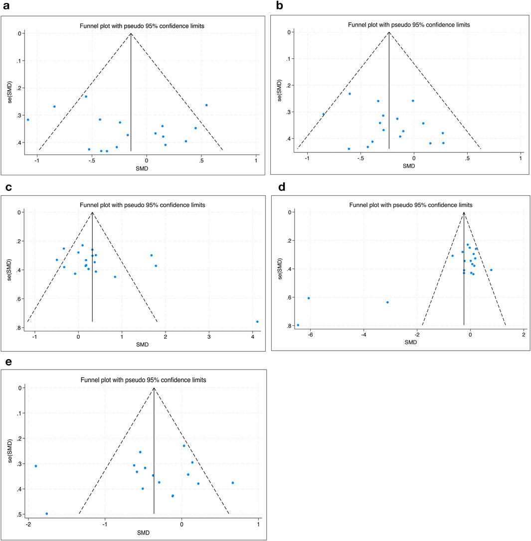 To quantify heterogeneity, I2 statistics were employed. The interpretation of I2 values followed conventional thresholds: 1) An I2 between 0% and 25% was considered to indicate low heterogeneity, implying minimal variability among the included studies. 2) Values from 25% to 50% represented moderate heterogeneity, suggesting a moderate degree of inconsistency that warranted exploration of potential influencing factors. 3) An I2 range of 50%–75% denoted substantial heterogeneity, highlighting notable differences likely attributable to variations in study methodologies, participant characteristics, or intervention types. 4) When I2 exceeded 75%, considerable heterogeneity was inferred, necessitating cautious interpretation of the aggregated results due to possible underlying biases or confounding elements. To enhance precision, 95% confidence intervals for I2 statistics were calculated using non-central chi-square approximation methods, as recommended in recent meta-analysis guidelines. To evaluate the risk of publication bias, funnel plot analysis was conducted as part of the diagnostic process.