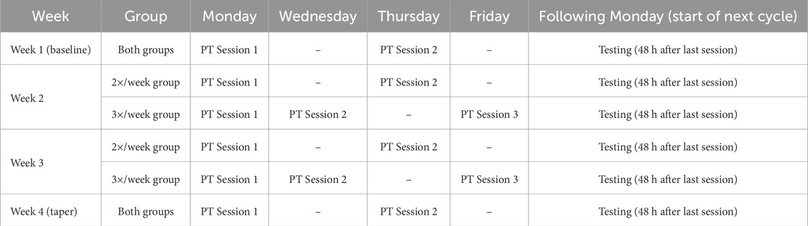 This investigation is a non-randomized observational cohort to examine the effects of training frequency on muscular performance. The research team did not intervene in the assignment process but simply monitored the participants and conducted assessments throughout the study period. Specifically, the study compared two groups: one that maintained a standard PT regimen and another that increased their PT sessions to three per week. The duration of the study spanned 4 weeks, with participants undergoing assessments once each week. Evaluations were conducted at the beginning of each week, 48 h after the final training session, to ensure adequate recovery (Table 1). All assessments were carried out under consistent environmental conditions: indoors at 5:00 p.m., with controlled temperature (ranging from 20.5°C to 21.5°C) and relative humidity maintained between 52% and 55%. In the initial week, all participants followed the same routine of two PT sessions per week, which mirrored the structure they had been adhering to over the previous month. This first week served as the baseline for subsequent comparisons. Beginning in week two, participants were divided into two distinct groups. One group continued with the two-session weekly format, while the other transitioned to a higher frequency, engaging in PT 3×/week. Athlete progress and responses were closely monitored throughout the intervention period.
