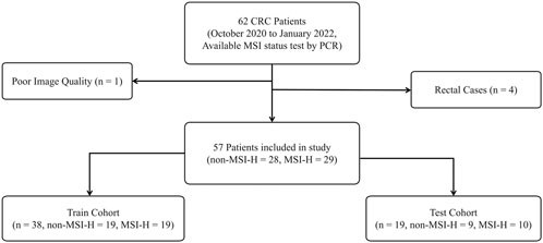 Flowchart of cohort selection for a study with 62 colorectal cancer patients. One excluded due to poor image, four due to rectal cases, leaving 57. These are divided into training cohort (38 patients: 19 non-MSI-H, 19 MSI-H) and test cohort (19 patients: 9 non-MSI-H, 10 MSI-H).