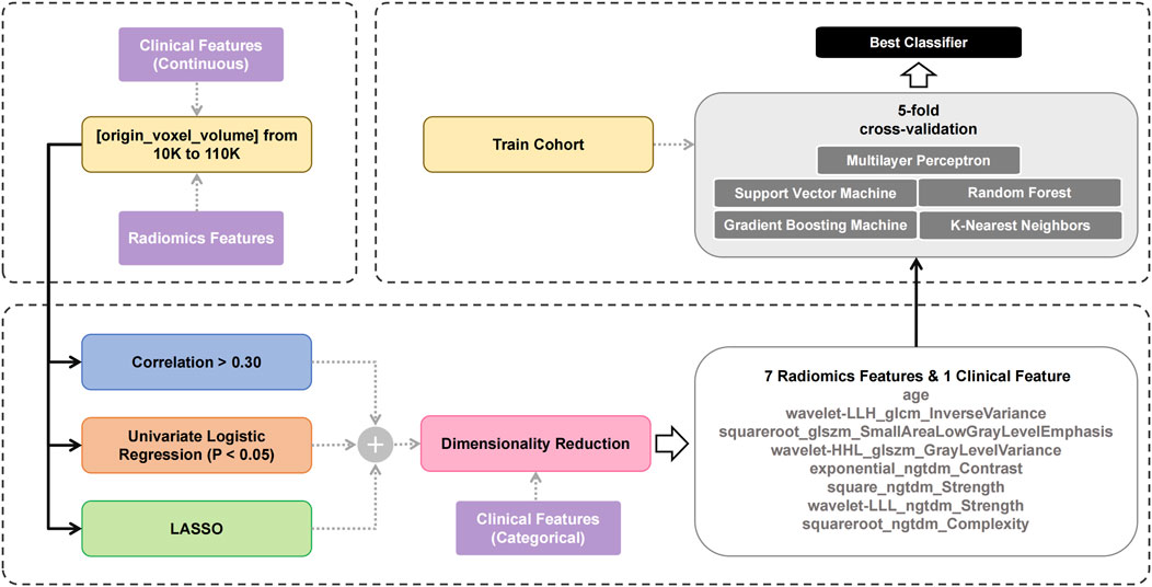 Flowchart depicting a machine learning workflow. Clinical and radiomics features are processed through correlation, logistic regression, and LASSO, followed by dimensionality reduction. The train cohort undergoes five-fold cross-validation using multiple classifiers: multilayer perceptron, support vector machine, random forest, gradient boosting decision trees, and k-nearest neighbors. The best classifier is selected. The process involves 7 radiomics features and 1 clinical feature, including age.