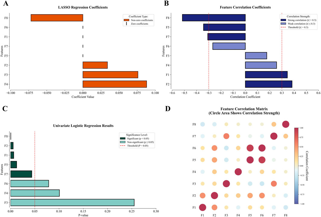 Panels display various statistical analyses. Panel A shows LASSO regression coefficients for features F1 to F8, with non-zero coefficients marked. Panel B displays feature correlation coefficients, indicating strong and weak correlations. Panel C presents univariate logistic regression results, highlighting significant and non-significant p-values. Panel D illustrates a feature correlation matrix, where circle size represents correlation strength, with a gradient color scale indicating coefficient values.