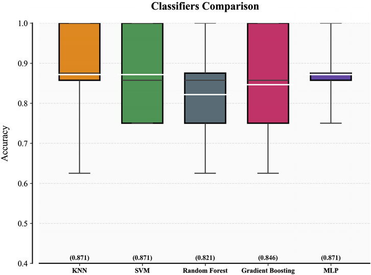 Figure 4 displays the five-fold cross-validation accuracy metrics for five classifiers trained on the 8-feature subset. The white line inside each box indicates the multifold mean accuracy (numerical values are displayed in brackets above the x-axis), and the black line represents the median. Three models—KNN, SVM, and MLP—demonstrated superior predictive capabilities with mean accuracy thresholds exceeding 0.85, indicating robust consistency in their high performance. Random Forest and Gradient Boosting underperformed slightly in contrast, with mean accuracies of 0.821 and 0.846, respectively. The fold-specific prediction accuracy of each classifier during 5-fold cross-validation is presented in Supplementary Material S2, revealing inter-fold variability that reflects the differential adaptability of models.