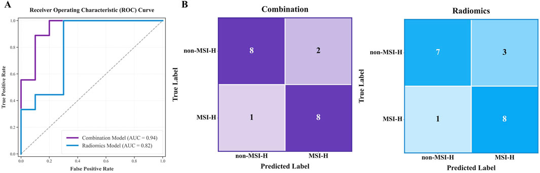 Panel A shows a Receiver Operating Characteristic (ROC) curve comparing a combination model with an AUC of 0.94 and a radiomics model with an AUC of 0.82. Panel B presents two confusion matrices. The left matrix for the combination model shows true labels versus predicted labels: non-MSI-H with eight true positives and two false negatives, MSI-H with one false positive and eight true positives. The right matrix for the radiomics model displays non-MSI-H with seven true positives and three false negatives, MSI-H with one false positive and eight true positives.