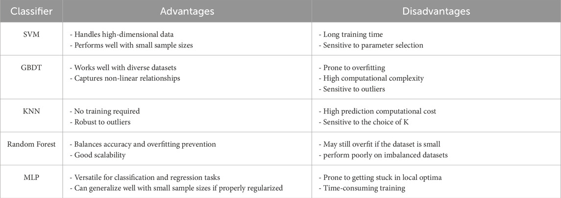 Five classical machine learning classifiers (support vector machines (SVM), gradient boosting decision trees (GBDT), k-nearest neighbors (KNN), random forest (RF), and multilayer perceptron (MLP)) were incorporated in this study. Each algorithm has strengths and limitations in handling data distributions, feature complexity, and noise (Caruana and Niculescu-Mizil, 2006; Fernández-Delgado et al., 2014), as shown in Table 1. Comparative evaluation facilitates the identification of classifiers that achieve an optimal balance between accuracy and computational efficiency, supporting model building that aligns with research requirements.