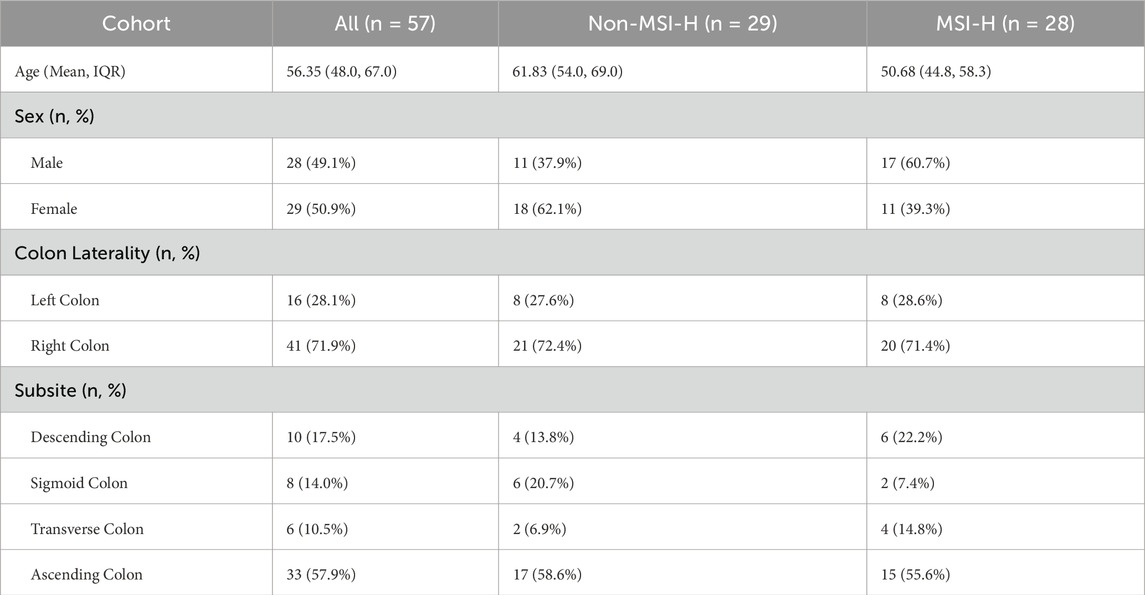 This study enrolled 57 colon cancer patients (28 males, 29 females), divided into non-MSI-H and MSI-H groups. The MSI-H group was younger (50.7 vs. 61.8 years) and had a higher proportion of males. Most tumors were right-sided (71.9%), with the ascending colon as the primary subsite (57.9% overall; 58.6% in non-MSI-H). No significant differences were observed in subsite distribution (ascending/transverse/descending/sigmoid) or colon laterality (right/left) between groups, indicating similar spatial patterns. See Table 2 for complete clinical comparison.