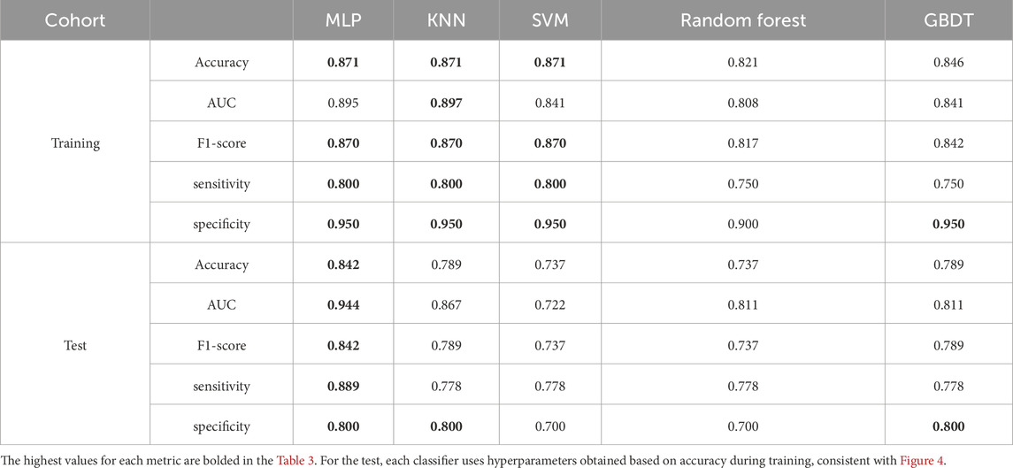 Table 3. Metrics of five classifiers on the training and test cohorts.