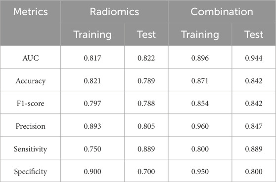 The combination model performed better, with AUC 0.944 (95% CI 0.841–1.000) and accuracy 0.842, compared to AUC 0.822 and accuracy 0.789 for the radiomics model on the test cohort. Confusion matrix analysis showed the combined model made three errors with the higher specificity, while the radiomics model made four errors (misclassifying 3 Non-MSI-H cases). A more detailed performance comparison between the two prediction models is illustrated in Table 4: Apart from the sensitivity metric on the test cohort, the combination model outperforms the radiomics model in all other metrics: the combination model exhibits stronger discriminative power (an increase of 7.9% in AUC on the training cohort and 12.2% on the test cohort) and higher classification accuracy (an improvement of 5.0% in accuracy on the training cohort and 5.3% on the test cohort). These comparisons confirm that age significantly improves predictive reliability, aligning with the results of feature selection.