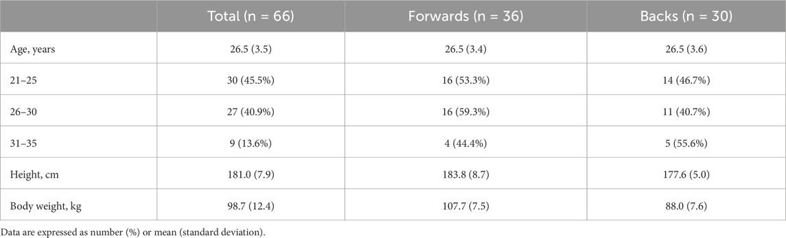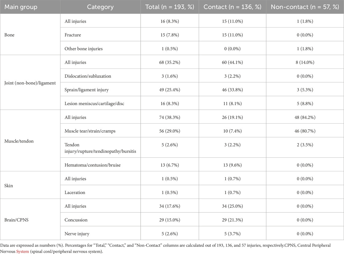Injury was defined as physical discomfort that occurred during training or a match that prevented full participation in a training session or match. Injuries were diagnosed and classified by the team medical staff according to the 2007 consensus statement of the International Rugby Board (Fuller et al., 2007). Furthermore, the severity (number of days unavailable for training and/or matches), mechanism of injury (contact or non-contact), session in which the injury occurred (training or match), and type of injury were categorized as previously reported (Fuller et al., 2007). In accordance with the 2007 consensus statement, contact injuries were defined as those arising from contact with another player or object at the moment of injury. Any instances of indirect contact (e.g., a tackle to the upper body causing a knee ligament injury from the resulting twist) were also classified as contact injuries, as the statement does not differentiate a separate “indirect contact” category. Non-contact injuries were defined as those occurring in the absence of direct physical contact at the moment of injury. To reach a consensus on classification, all injury diagnoses and mechanisms were reviewed by at least two members of the medical team.