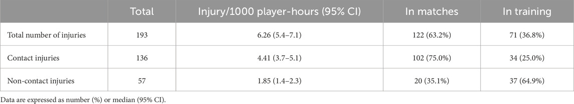 In this study, we investigated the association between “contact load” calculated using contact intensity and volume, and the occurrence of injuries in elite rugby union players. A total of 136 contact injuries and 57 non-contact injuries occurred during the study, both of which were significantly associated with “contact load,” regardless of injury type. In recent years, World Rugby has emphasized managing training load as a key strategy for player welfare and injury prevention. Specifically, they have developed and recommended the use of guidelines for monitoring and managing the “contact load” (Starling et al., 2023). Our previous study demonstrated that an increased acute:chronic workload ratio (ACWR) of “contact load” is associated with injury risk (Iwasaki et al., 2024). In this study, we also showed that “contact load” was associated with the occurrence of both contact and non-contact injuries in elite rugby union players. Our findings provide additional evidence supporting the importance of monitoring “contact load” for predicting and preventing all rugby union injuries.