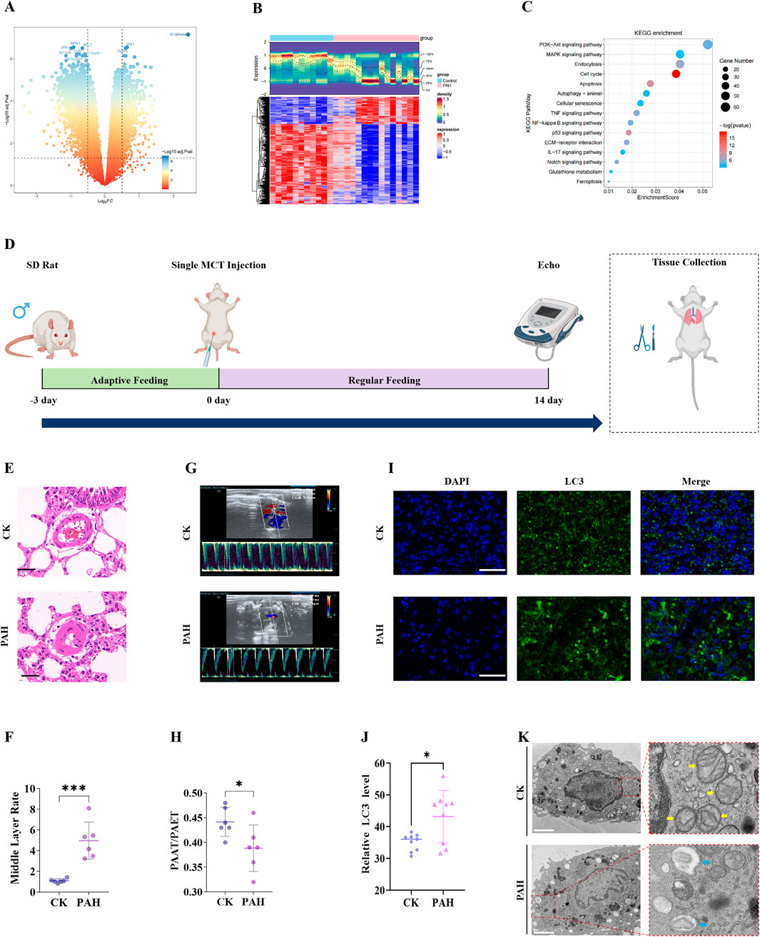 Figure 1. Bioinformatics analysis of PAH-associated DEGs and in vivo validation. (A) volcano plot of DEGs in the GSE113439 training set; (B) Heatmap of DEGs; (C) KEGG pathway enrichment analysis shows a significant association of DEGs with mitophagy-related pathways; (D) Schematic of the monocrotaline-induced PAH rat model; (E) H&E staining of rat lung tissue demonstrating histopathological changes (Scale bar 50 μm); (F) quantification of pulmonary arterial medial wall thickness from H&E images. (G) Echocardiographic assessment of PAH model validation. (H) quantitative echocardiographic parameters: PAAT/PAET; (I) Immunofluorescence detection of LC3 expression in rat lung tissue (Scale bar 100 μm); (J) quantitative analysis of LC3 immunofluorescence intensity; (K) TEM of mitochondrial morphology: yellow arrows indicate normal mitochondria in the CK,and blue arrows indicate mitophagosome formation and reduced mitochondrial area in the PAH group. Scale bar: 2 μm. Data are presented as mean ± SEM. ns, p > 0.05; *p < 0.05; **p < 0.01; ***p < 0.001; ****p < 0.0001.