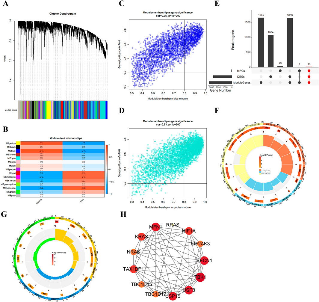 Figure 2. Identification and analysis of 13 candidate genes associated with PAH and mitophagy. (A) dendrogram showing the 14 co-expression modules identified by WGCNA; (B) Heatmap of module-trait correlations: The blue and turquoise modules exhibit the strongest correlations with PAH status; (C) scatterplot of gene significance versus module membership for the blue model; (D) Scatterplot of gene significance versus module membership for the turquoise model; (E) venn diagram illustrating the intersection of DEGs, key module genes, and MRGs, yielding 13 candidates; (F) GO enrichment analysis of the 13 candidate genes, showing the top enriched term; (G) KEGG pathway enrichment bubble chart for the 13 candidate genes; (H) PPI network of the 13 candidate genes.