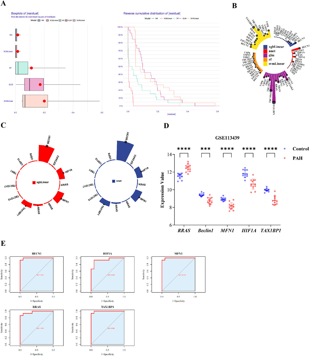 To further refine biomarkers associated with mitochondrial autophagy and PAH, five machine learning models SVM, GLM, NN, RF, and XGBoost were trained using the training dataset. Model performance was subsequently assessed. Feature importance rankings derived from the XGBoost and neural network models were intersected, resulting in the identification of five top candidate genes (Figure 3A; Supplementary Table S10). These genes were designated as key biomarkers: RRAS, BECN1, MFN1, HIF1A, and TAX1BP1 (Figures 3B,C).
