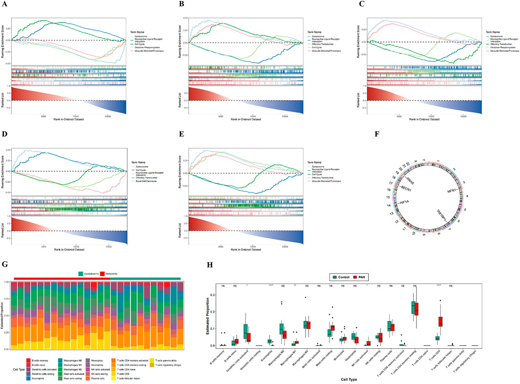Figure 4. GSEA enrichment analysis, chromosomal localization, and immune infiltration analysis. (A–E) GSEA enrichment analysis of five candidate genes; (F) chromosomal localization map of five candidate genes; (G) infiltration analysis of 22 immune cell types between PAH patients and normal controls; (H) box plots of estimated proportions of 22 immune cell types in control and PAH lung tissues. In the figures, ns indicates p > 0.05; *p < 0.05; **p < 0.01; ***p < 0.001; ****p < 0.0001.