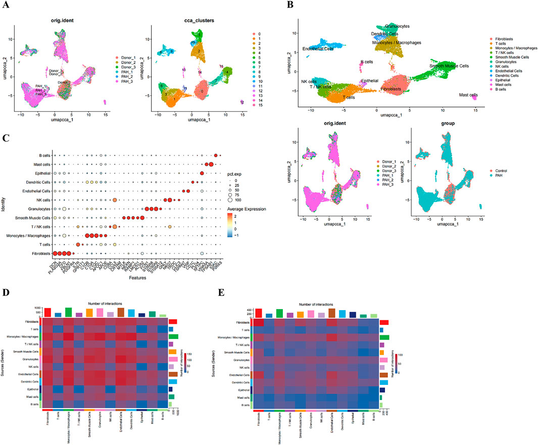 Figure 5. Single-cell clustering and intercellular communication analyses. (A) UMAP projection of all cells prior to annotation; (B) UMAP plot with cells colored by annotated cell type; (C) expression of canonical marker genes across the annotated cell types; (D, E) Heatmaps showing the number of potential ligand-receptor pairs between cell types in the CK (D) and PAH (E).