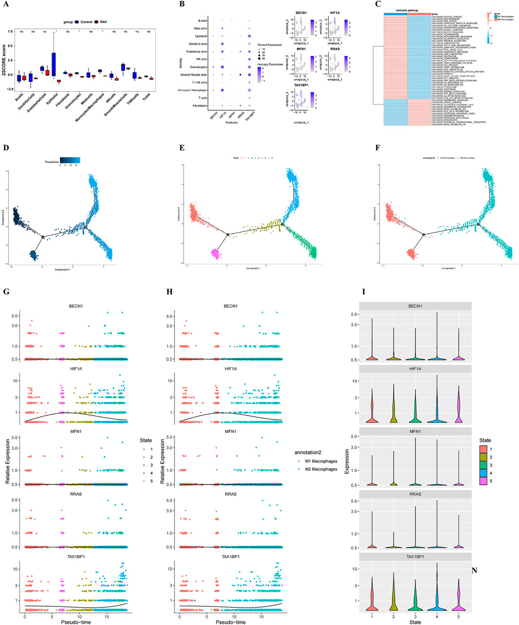 Figure 6. Identification of key cell type, pseudotime trajectories, and dynamic biomarker expression. (A) bar plot showing differential proportions of cell clusters between PAH and control samples; (B) Bubble plot illustrating the expression levels of the five candidate genes across annotated cell types; bubble size indicates the percentage of expressing cells, and colour intensity reflects expression magnitude; (C) heatmap of pathway enrichment analysis in the identified key cell population; (D–F) Pseudotime trajectory analysis of the key cell type: each point represents an individual cell coloured by pseudo time (dark blue = early state; light blue = late state). Black circles with numbers denote distinct cell-state nodes identified during trajectory inference; (G, H) dynamic expression changes of BECN1, HIF1A, MFN1, RRAS, and TAX1BP1 along pseudotime in macrophage subtypes, stratified by cell state; (G) and macrophage polarization (M1 vs. M2) (H); (I) Violin plots showing state-specific expression patterns of the five hub genes.