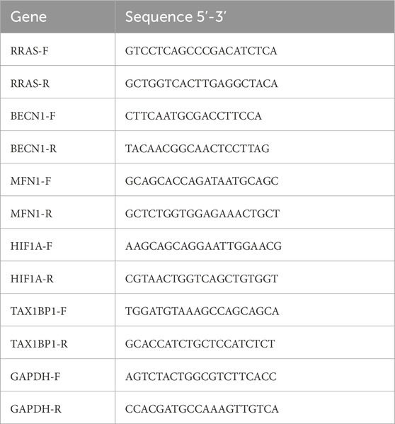 Proteins were transferred onto PVDF membranes (Merck Millipore, SEQ00010) and blocked with 5% nonfat milk in TBS-T for 1 h at room temperature. Membranes were incubated overnight at 4 °C with primary antibodies diluted in blocking buffer: RRAS (Proteintech, 66959-1-Ig; 1:1000), BECN1 (Proteintech, 66665-1-Ig; 1:1000), MFN1 (Zenbio, R27027; 1:1000), TAX1BP1 (Hanan Biotechnology, HA721648; 1:1000), HIF1A (Abcam, ab179483; 1:1000), and β-actin (Proteintech, 66009-1-Ig; 1:25,000). After washing, membranes were incubated for 40 min at room temperature with either HRP-conjugated goat anti-rabbit IgG (Proteintech, SA00001-2; 1:3000) or HRP-conjugated goat anti-mouse IgG (Servicebio, GB23301; 1:3000).