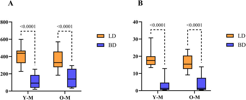 As shown in Figure 3A, cortisol was also only altered in males by the occurrence of BD (p < 0.0001), whose values were decreased significantly in both Y [92.32 nmol/L (186.48–38.22)] and O [139,98 nmol/L (257.52–43.42)] groups when compared to LD, Y [437.7 nmol/L (468.3–324.1)] and O [329.75 nmol/L (457.95–277.12)]. Figure 3B shows that for testosterone, the results were in line with the steroid levels, as BD values were decreased in Y [1.32 nmol/L (4.64–0.49)] and O [1.37 nmol/L (7.40–0.51)] when compared to LD in both age groups, Y [17.51 nmol/L (19.97–14.98)] and O [15.41 nmol/L (20.38–12.61)] (p = 0.0001).