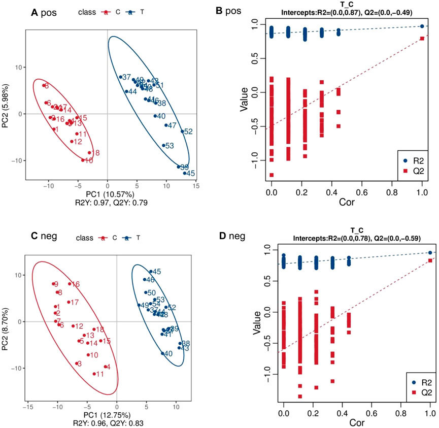 Figure 1. PLS-DA scatter point diagram and sequencing test diagram of positive and negative ion mode between PCA group (T) and control group (C) (A) pos (B) pos (C) neg (D) neg.