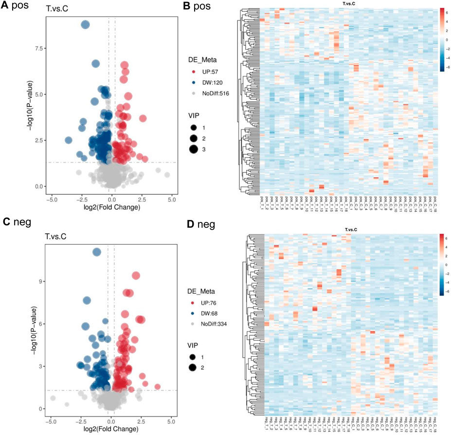 Figure 2. Volcano map and cluster heat map of two groups in positive and negative ion mode (A) pos (B) pos (C) neg (D) neg.