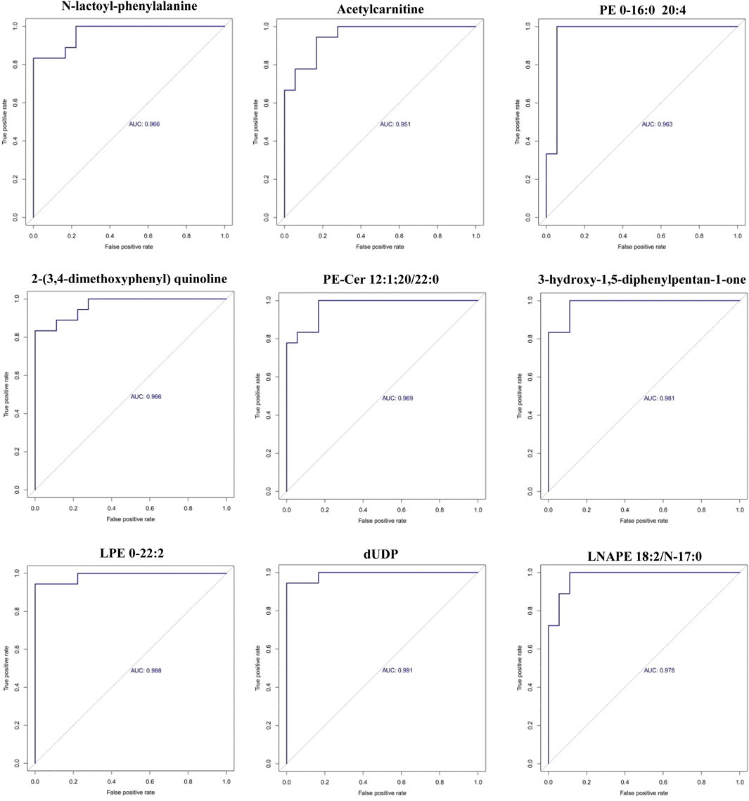 Figure 3. ROC curves of the 9 differential metabolites between PCA group and control group (x-axis: False positive rate; y-axis: True positive rate).