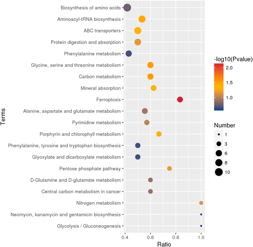 Figure 4. Bubble map of KEGG enrichment analysis of differential metabolites between PCA group and control group (top 20).