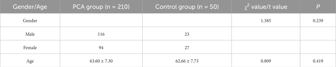In this study, the PCA group consisted of 210 patients, including 116 males (55.23%) and 94 females (44.76%). The control group consisted of 50 individuals, including 23 males (46.0%) and 27 females (54.0%). The age range of both groups was 40–75 years, with a mean age of 63.60 ± 7.30 years of the PCA group and 62.66 ± 7.73 years of the control group. No statistically significant differences were observed between the two groups in terms of gender (P > 0.05) or age (P > 0.05), as detailed in Table 1.