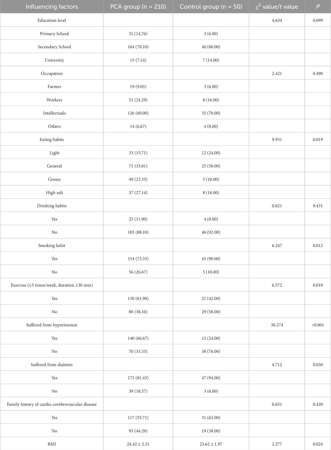 A comparison of influencing factors between PCA group and control group revealed that the prevalence of smoking, hypertension, and diabetes were significantly higher in PCA group than control group (P < 0.05). Furthermore, a significantly lower proportion of individuals in PCA group reported regular exercise habits compared to control group (P < 0.05), while PCA group exhibited a significantly higher BMI level than the control group (P < 0.05). Statistically significant differences were also observed in dietary habits between the two groups (P < 0.05). However, no significant differences were found between the groups regarding education level, occupation, drinking habits, or family history of cardiovascular and cerebrovascular diseases (P > 0.05), as detailed in Table 2.