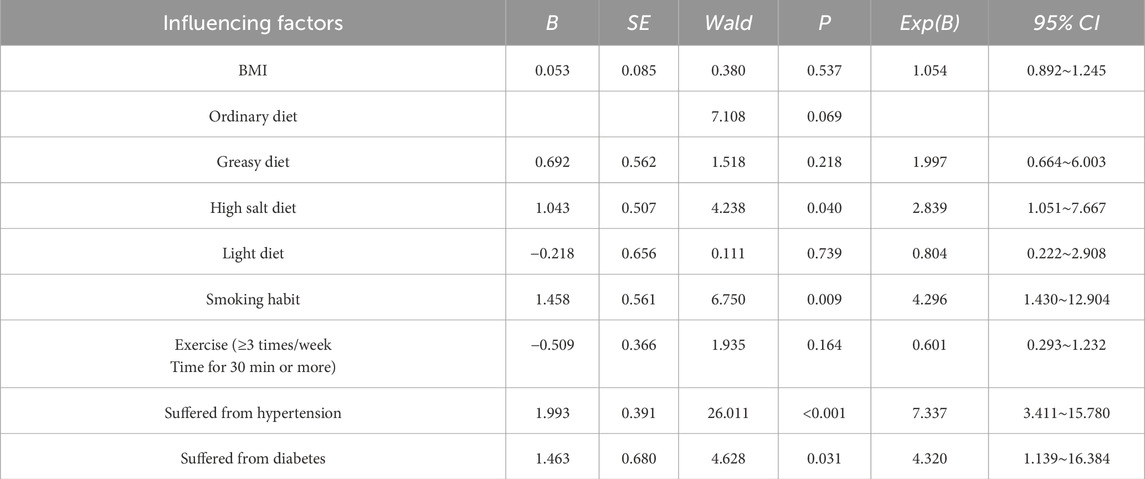 Based on the results of the univariate analysis, factors exhibiting statistically significant differences between the two groups were included in the multivariate analysis. The results indicated that smoking, a high-salt diet, hypertension, and diabetes were identified as significant risk factors for PCA (P < 0.05), while no significant associations were observed for other factors (P > 0.05). Specifically, smoking, a high-salt diet, hypertension, and diabetes were all associated with increased odds ratios (OR > 1). Smokers had a 4.296-fold higher risk of developing PCA compared to non-smokers (OR = 4.296). Individuals with a high-salt diet exhibited a 2.839-fold higher risk compared to those without this dietary habit (OR = 2.839). Hypertension was associated with a 7.337-fold higher risk compared to individuals without hypertension (OR = 7.337). Similarly, patients with diabetes had a 4.320-fold higher risk compared to those without diabetes (OR = 4.320), as detailed in Table 3.