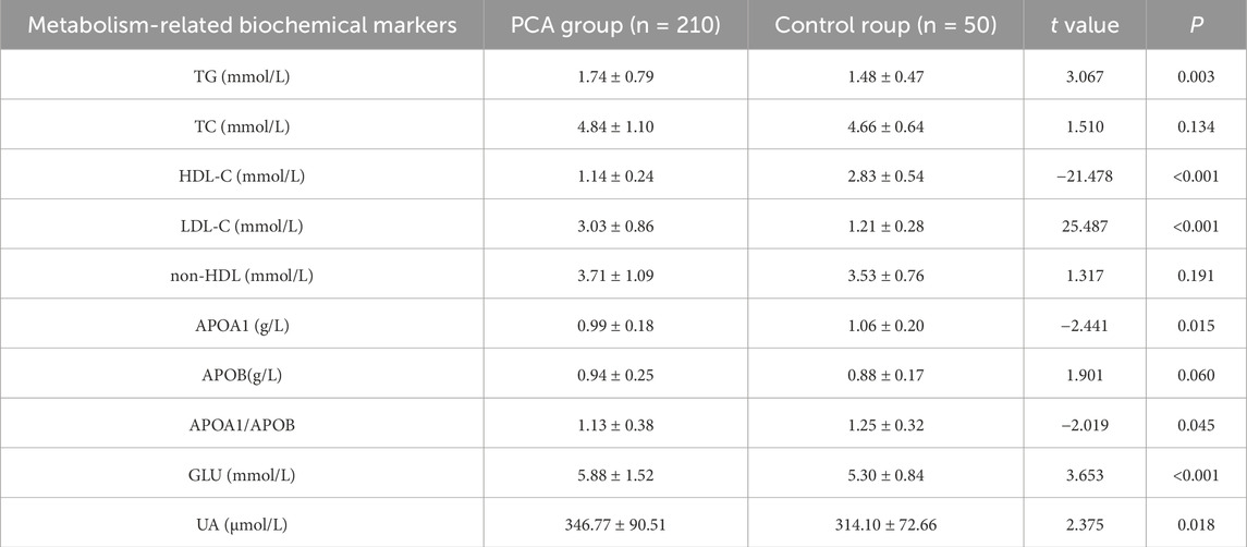 Biochemical markers related to metabolism in plasma, including TG, TC, HDL-C, LDL-C, non-HDL, APOA1, APOB, APOA1/APOB ratio, GLU, and UA levels, were compared between PCA group and control group. Compared to control group, PCA group exhibited significantly higher levels of TG, LDL-C, GLU, and UA (P < 0.05). In contrast, HDL-C levels, APOA1 levels, and the APOA1/APOB ratio were significantly lower in PCA group (P < 0.05). No significant differences were observed between the two groups in terms of TC levels, non-HDL, or APOB (P > 0.05), as detailed in Table 4.