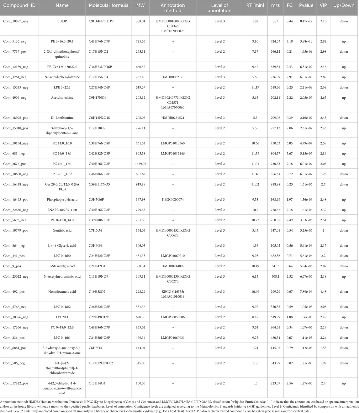 The raw data files obtained from UHPLC-MS/MS were processed using Compound Discoverer 3.3 (CD3.3, ThermoFisher) to perform peak alignment, peak picking, and metabolite quantitation. Key parameters were configured as follows: peak areas were corrected using the first quality control (QC) sample, with a mass tolerance of 5 ppm, a signal intensity tolerance of 30%, and a minimum intensity threshold. Subsequently, peak intensities were normalized to the total spectral intensity. The normalized data were utilized to predict molecular formulas based on additive ions, molecular ion peaks, and fragment ions. These peaks were then matched against the mzCloud (https://www.mzcloud.org/), mzVault, and MassList databases to obtain accurate qualitative and relative quantitative results. Statistical analyses were conducted using R (version 3.4.3), Python (version 2.7.6), and CentOS (release 6.6). For non-normally distributed data, standardization was performed using the formula: sample raw quantitation value/(sum of sample metabolite quantitation values/sum of QC1 metabolite quantitation values) to derive relative peak areas. Compounds with coefficient of variation (CV) values exceeding 30% in QC samples were excluded, yielding the final metabolite identification and relative quantification results.