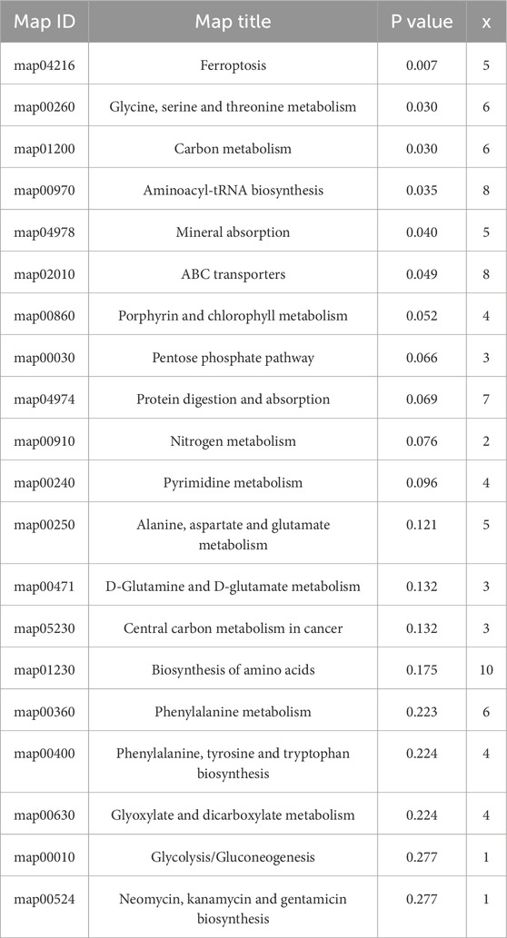 The differential metabolites between PCA group and control group were significantly enriched in various signaling pathways, as shown in the top 20 pathways listed in Table 6 and Figure 4. Key enriched pathways included ferroptosis, glycine, serine, and threonine metabolism, carbon metabolism, aminoacyl-tRNA biosynthesis, mineral absorption, the pentose phosphate pathway, protein digestion and absorption, nitrogen metabolism, pyrimidine metabolism, alanine, aspartate, and glutamate metabolism, D-glutamine and D-glutamate metabolism, biosynthesis of amino acids, phenylalanine metabolism, biosynthesis of phenylalanine, tyrosine, and tryptophan, glyoxylate and dicarboxylate metabolism, and glycolysis/gluconeogenesis. Figure 5 illustrates the KEGG classification of differential metabolites between PCA group and control group, with the top three categories being global and overview maps (22.97%), amino acid metabolism (13.06%), and lipid metabolism (11.26%).