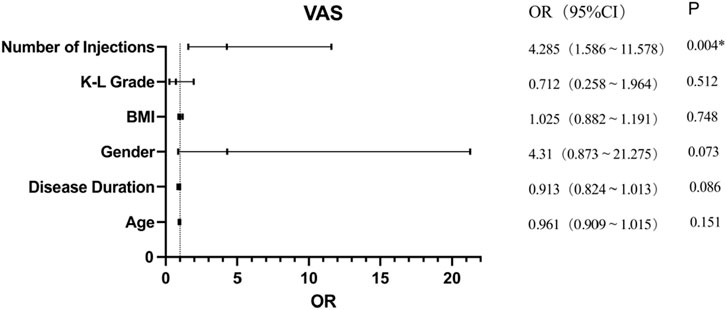 Univariate analysis showed that disease duration, sex, K-L grade, and number of injections influenced PRP treatment effectiveness according to VAS; however, further analysis of its effect using logistic regression analysis showed that only the number of injections (OR = 4.285, 95% CI: 1.586–11.578, p = 0.004) significantly affected PRP treatment effectiveness assessed using VAS scores (Figure 2). This suggests that repeated PRP injections are approximately four times more effective than a single injection in terms of VAS scores.