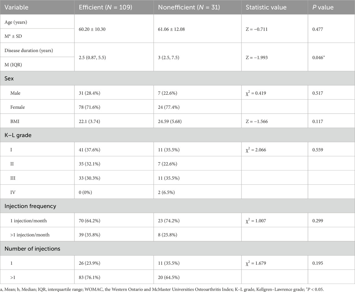 As shown in Table 4, univariate analysis of WOMAC scores also indicated a significant difference in disease duration between the effective and ineffective groups. The effective group had a shorter disease duration (2.5 years, IQR: 0.87–5.5) compared to the ineffective group (3 years, IQR: 2.5–7.5; Z = −1.993, P = 0.046). No significant differences were found between the effective and ineffective groups in terms of age, sex, KL grade, injection frequency, and the number of injections.