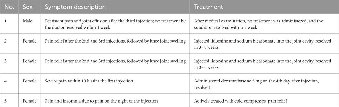 By the 6-month follow-up, four participants experienced a total of five adverse events associated with PRP intra-articular injections. The post-injection pain was effectively managed with lidocaine hydrochloride, sodium chloride solution, and diazepam, with the treatment durations ranging from immediate intervention to up to 4 weeks, depending on the characteristics and duration of the adverse reactions. The management of these adverse events is illustrated in Table 5.