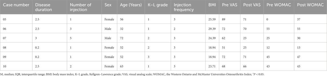 Statistical analysis was performed using SPSS Statistics, version 27.0 (IBM Corp., Armonk, NY, United States) and R version 4.1.0 (R Core Team, Vienna, Austria). A P-value <0.05 was considered statistically significant. Given the observational nature of our study, we followed the recommendation from a previous study (Ahmad and Halim, 2017) to set the sample size at 5–10 times the number of factors. For normally distributed continuous variables, estimated means and standard deviations were presented. Medians and interquartile ranges (IQR) were used for non-normally distributed variables. Normality was assessed through visual inspection of histograms or normal Q - Q plots and verified using the Kolmogorov–Smirnov test. Baseline between-group differences were determined using the Student’s t-test or Mann–Whitney U test, as appropriate. Categorical variables were analyzed via the chi-square or Fisher’s exact tests. Primary analyses were conducted on an available-case basis, including participants with both baseline and 6-month data; missing outcomes were not imputed. Additionally, a multivariate analysis was conducted with treatment effectiveness (categorized as effective or ineffective) as the dependent variable. Given that the dependent variable is categorical, logistic regression analysis was employed to assess the relationship between the predictors and the outcome of treatment effectiveness. Both continuous (age, BMI, disease duration) and categorical (sex, KL grade, number of injections) predictors were included in the model.