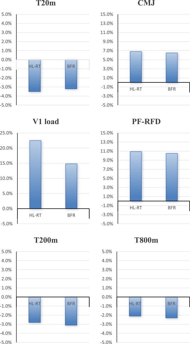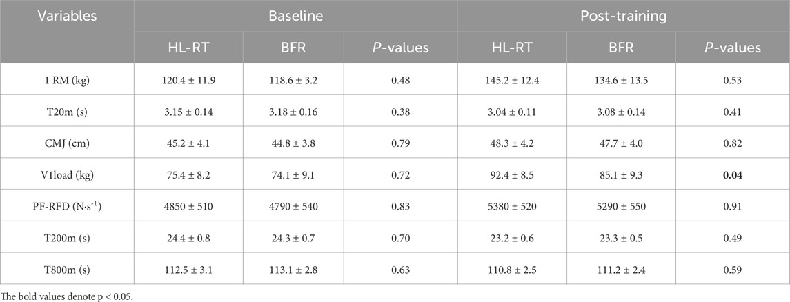 Results: Significant time effects were observed for T20m, CMJ, V1 load, PF-RFD, T200m, and T800m (all P < 0.05), and significant interaction effects between time and group was found for V1load (P < 0.05). Post-training comparisons between the HL-RT and BFR groups revealed a significant improvement in V1 load in the HL-RT group (P < 0.05), while no significant differences were found between the groups for the other performance measures. The present results indicate that both HL-RT and BFR training demonstrate positive effects on the muscular strength, power, endurance, and running performance, while HL-RT demonstrate greater gains in muscular power.