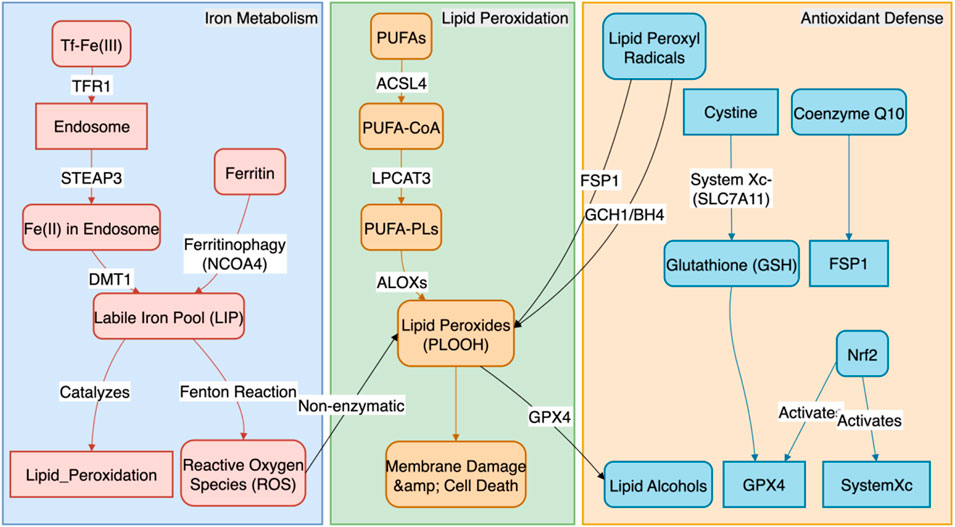 2. Iron Storage and Release: Under physiological conditions, excess iron is safely oxidized and stored in cytosolic ferritin complexes (composed of heavy-chain FTH1 and light-chain FTL). However, under ferroptosis-inducing conditions, the nuclear receptor coactivator 4 (NCOA4), a selective autophagy receptor, recognizes and binds to FTH1, mediating the degradation of ferritin in lysosomes (a process known as “ferritinophagy”). This releases large amounts of stored iron into the LIP, providing ample Fe2+ substrate for the Fenton reaction (Mancias et al., 2014).