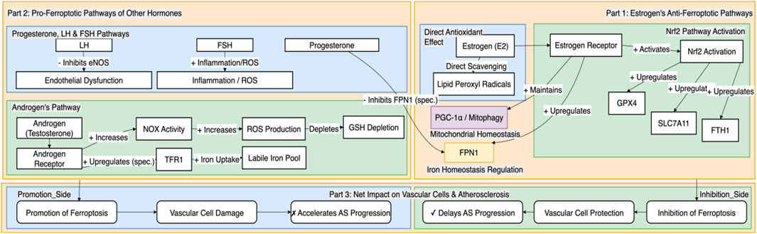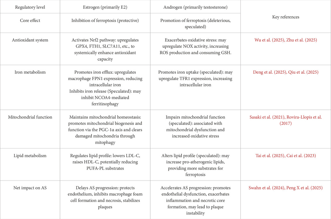 Connecting the significant sex differences in AS with this recently identified cell death modality of ferroptosis leads to a critical scientific question: Do sex hormones, as major biological determinants of sexual dimorphism, influence the sex-specific clinical progression of AS by directly or indirectly regulating the molecular machinery of ferroptosis? Although the macroscopic effects of sex hormones on the cardiovascular system (Swahn et al., 2024) and the independent role of ferroptosis in AS (Xu et al., 2024; Jinso et al., 2025) have been extensively studied, there is a scarcity of research that systematically elucidates the intrinsic molecular links between the two. For example, evidence has shown that low testosterone levels in men are significantly associated with endothelial dysfunction and increased arterial stiffness (Sakamuri et al., 2024), while other studies have observed a close relationship between sex hormone levels and markers of vascular inflammation (Souza et al., 2023). These findings provide evidence that sex hormones regulate the progression of AS by influencing vascular function and inflammation.