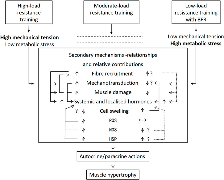 Figure 1. Mechanism of resistance training load/pattern on muscle hypertrophy (Pearson and Hussain, 2015). Note: The relative contributions of mechanical tension and metabolic stress in mediating muscle hypertrophy, depending on the training load and/or modality. The arrows highlight the potential degrees of activation of the resultant intermediate secondary mechanisms and their possible relationships. Vertical arrows (↕) represent higher/lower degrees of activation; horizontal arrows (↔) represent no effect; interconnecting arrows represent potential relationships between secondary mechanisms; and dotted interconnecting arrows indicate equivocal relationships. HSP, heat shock proteins; NOS, nitric oxide synthase; ROS, reactive oxygen species.