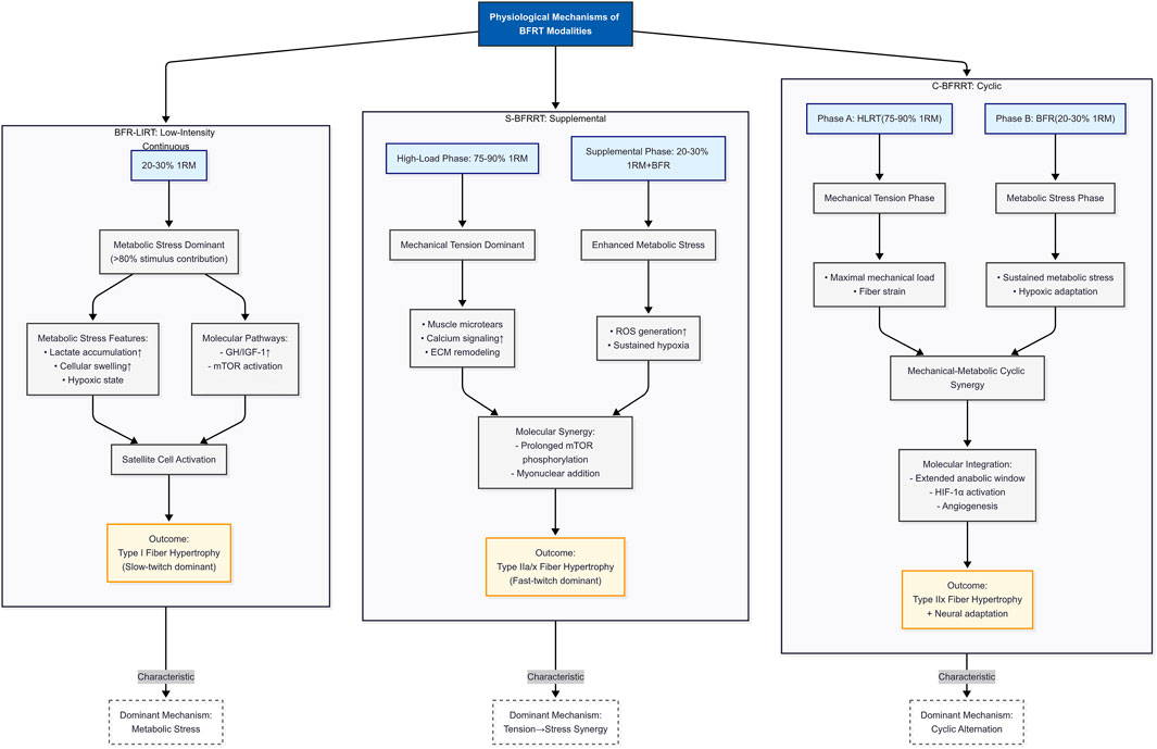 This review synthesizes the current literature to compare the theoretical mechanisms and practical applications of three primary BFRT modalities (BFR-LIRT, S-BFRRT, C-BFRRT). Based on a narrative synthesis of available studies, it appears that BFRT can achieve unique physiological effects by modulating mechanical tension and metabolic stress pathways to varying degrees. The evidence suggests that BFR-LIRT may primarily induce type I fiber hypertrophy through metabolic stress, making it a valuable tool for rehabilitation. S-BFRRT seems to create acute synergy by combining high-load tension with metabolic stimuli, potentially benefiting strength maintenance. C-BFRRT, through its periodized structure, holds promise for inducing integrated adaptations, potentially favoring type II fiber specialization during preparatory phases.