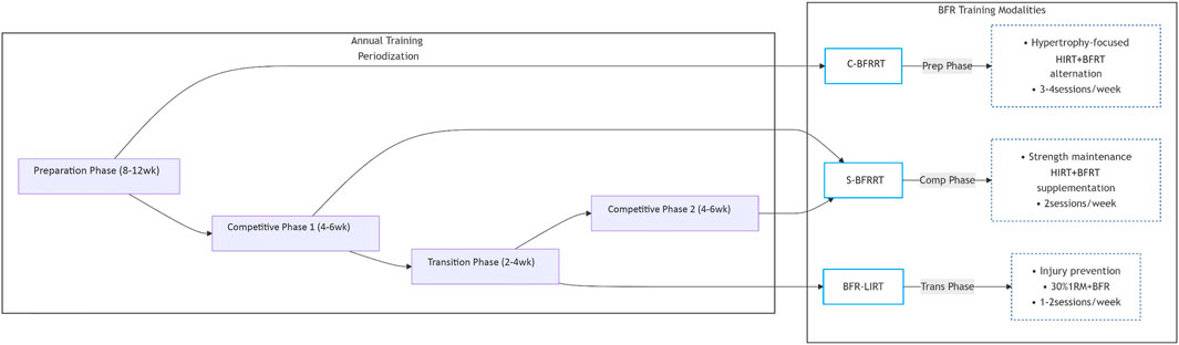 The periodized application of BFRT modalities follows a logical temporal sequence aligned with specific training objectives. Taking the annual training cycle of basketball players as an example, during the 8–12 weeks preparation phase, athletes focus on muscle hypertrophy and foundational strength development by adopting the C-BFRRT modality. This involves alternating high-intensity training sessions (e.g., squats and deadlifts at 70%–85% 1RM) with low-intensity BFRT sessions (e.g., leg press at 30% 1RM) on a weekly basis, effectively activating type II muscle fibers and increasing muscle cross-sectional area. Upon entering Competition Phase 1 (4–6 weeks), the training emphasis shifts to maintaining maximal strength, making S-BFRRT the preferred modality. For instance, after technical training during game weeks, high-intensity bench presses (90% 1RM) combined with low-load BFR bench presses (20% 1RM) can be implemented to prolong mTOR pathway activation and preserve type IIa/x muscle fiber function. If the season comprises multiple segments (e.g., regular season and playoffs), S-BFRRT may continue to be used in Competition Phase 2, with a transition to BFR-LIRT during the interval between competitive periods to maintain muscle metabolic activity with low joint load, thereby preserving strength while minimizing excessive fatigue. During the transition phase (2–4 weeks) after the season, BFR-LIRT is prioritized, involving 1–2 weekly sessions of full-body low-intensity circuit training (30% 1RM) to promote neuromuscular recovery and injury repair while sustaining basal anabolic levels.
