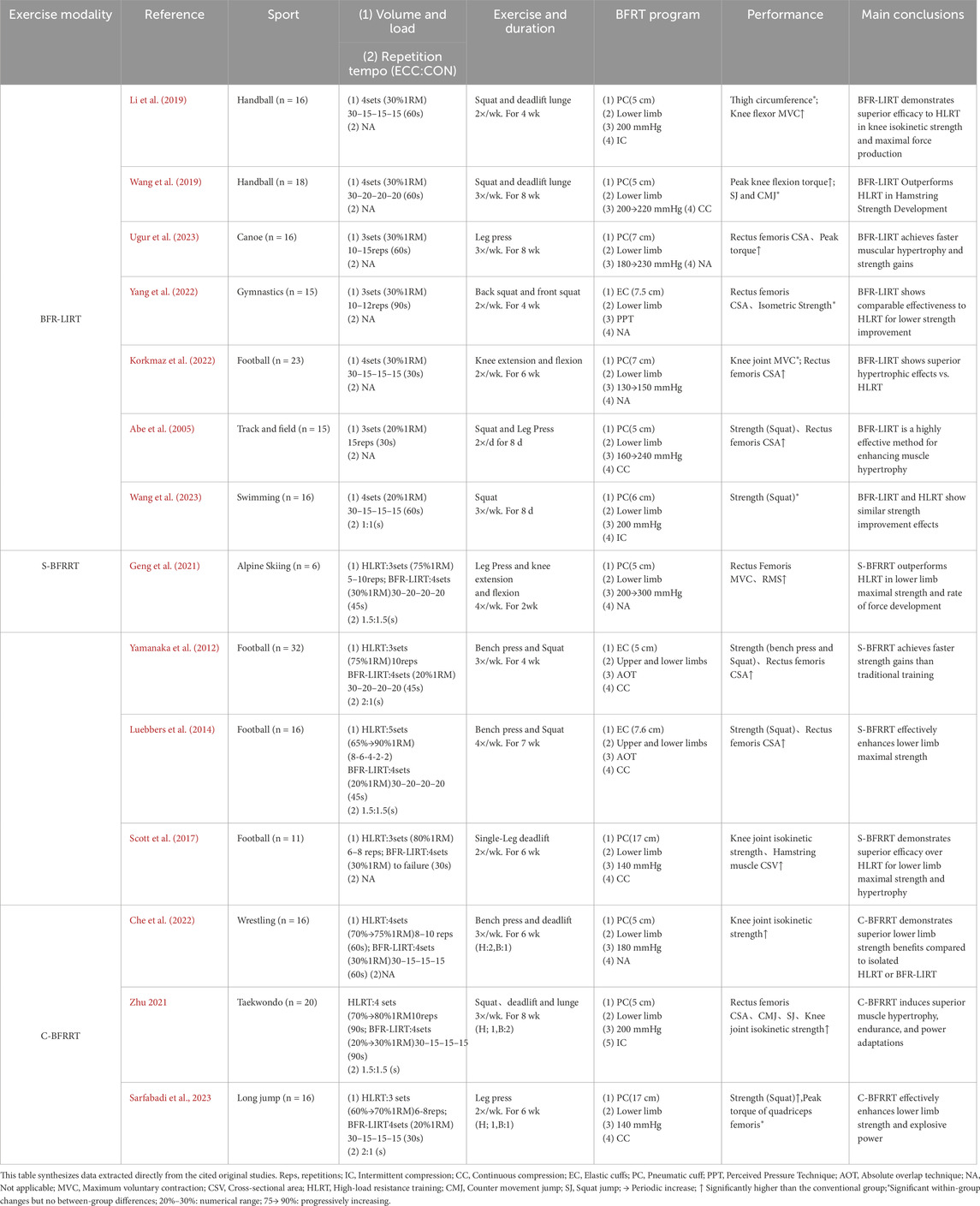 Unlike BFR-LIRT, which relies solely on metabolic stress, Supplementary blood flow restriction resistance training integrates high-load resistance exercise with subsequent low-load BFRT (1-2 exercises per muscle group) to optimize muscular adaptations through combined mechanical tension and metabolic stress. This approach effectively recruits typically under activated type I muscle fibers (Yasuda et al., 2011), as demonstrated by significant vastus lateralis hypertrophy in national weightlifters following 6-week S-BFRRT (30% 1RM squats post HLRT) (Bjornsen and Wernbom, 2019b). Supporting evidence from Paralympic skiers shows that 2-week high-frequency S-BFRRT (200→300 mmHg, 30% 1RM) preferentially improved weaker-leg MVC (p < 0.05), with female athletes exhibiting greater neuromuscular enhancements (RMS and RFD) than males (Geng et al., 2021). Yamanaka et al. (2012) found that 4-week S-BFRRT improved strength (bench press +7.0%, squat +8.0%) without limb hypertrophy, whereas Luebbers et al. (2014) later reported significant squat 1RM gains (p < 0.05) after 7 weeks. However, later findings (Scott et al., 2017) indicated no additional benefits from 5-week S-BFRRT during preseason training, potentially due to training saturation or fatigue. Collectively, these findings demonstrate the context-dependent efficacy of S-BFRRT, which is particularly valuable for rehabilitation, neuromuscular compensation, and in-season strength development when implemented with progressive pressure (150→300 mmHg) and a moderate load (30% 1RM). However, the current limitations, including small sample sizes and uncontrolled confounders, warrant further investigations.
