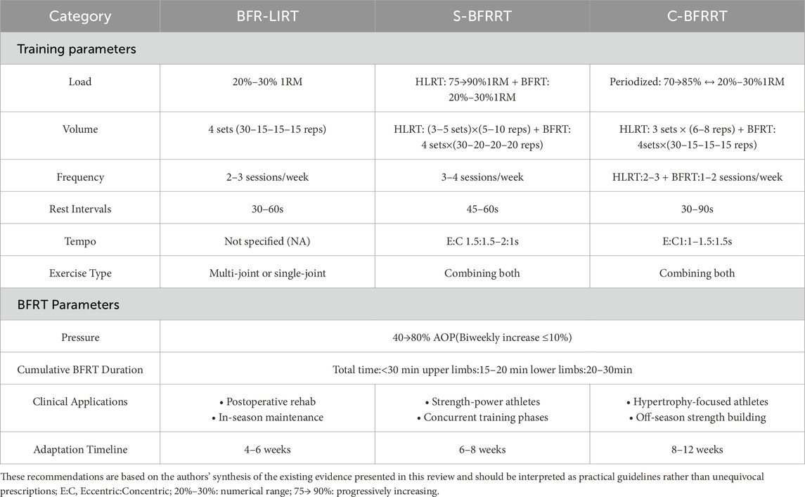 This section translates the mechanistic insights and empirical findings discussed previously into evidence-informed practical guidelines. Table 2 serves as the central reference, synthesizing recommended training parameters for the three BFRT modalities. These recommendations are the product of a qualitative synthesis of studies identified through targeted searches of academic databases (e.g., PubMed, Google Scholar) using keywords related to BFRT, athletes, strength, and hypertrophy. Priority was given to randomized controlled trials, longitudinal studies, and high-quality case studies conducted in athletic populations. The primary objective of these distinct approaches is to achieve specific adaptive outcomes: BFR-LIRT aims for rehabilitation and tissue-sparing maintenance, S-BFRRT for concurrent strength and hypertrophy during demanding phases, and C-BFRRT for maximal morphological adaptations during dedicated preparation periods. The following subsections (4.1–4.8) provide a detailed rationale and discussion for the parameters summarized in Table 2.