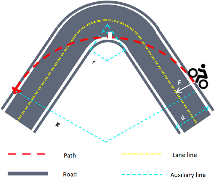 In the model, when a cyclist makes a turn, we define the moment of entering and leaving the corner as the starting and ending points of the arc, respectively. At this time, the path of the cyclist is tangent to the outer boundary of the road. During the intermediate stage of the turn, the vertex of the inner boundary of the road is tangent to the arc, thereby achieving the optimal turning route. In the calculation process, to obtain the optimal radius, it is necessary to know the width d of the road, the intersection angle θ of the two roads, and the radius r of the inner bend of the road. As shown in Formula 6.
