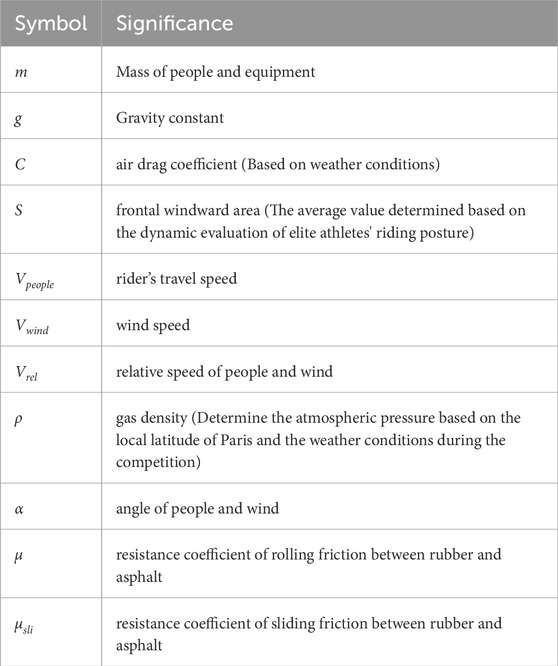 Furthermore, the influence of weather conditions has been taken into account in this research. Wind direction and speed are added up to the power-velocity model. In the model, the impact of air resistance on bicycle riding speed and power has been considered. Air resistance represents the reverse force exerted by the air on the moving object during riding. When investigating the influence of wind on riding, the effect of headwind is included within the air resistance. The wind resistance is defined as Fair. The symbols used in the force analysis are listed in Table 1.